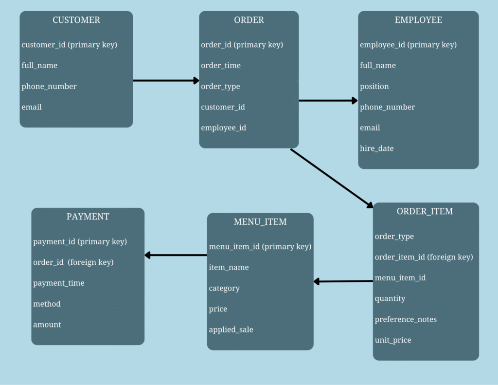 For this activity the chosen organization was Demetres, which is a popular, tasty, Toronto based dessert restaurant chain. they are known for their amazing and hand crafted dessert items. Here you will see the Database diagram created for Demetres. The diagram was made using Canva